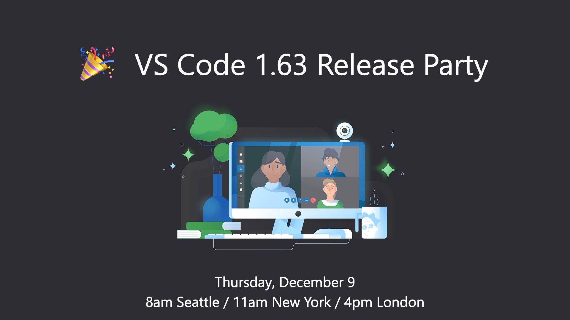 Last Release Party of 2021 🎉 It's almost time for a new VS Code update, and we can't wait to share with you what we've been working on. Join us on Thursday for a livestream and Q&A with the team ▶️