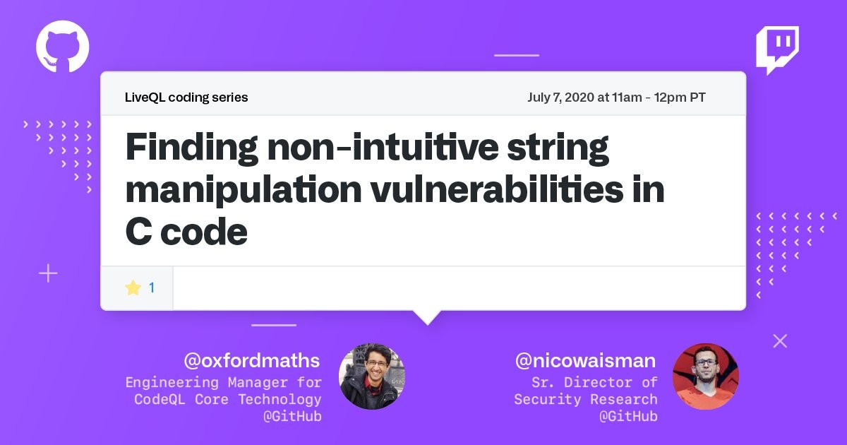 Join @oxfordmaths and @nicowaisman for LiveQL, an unscripted live auditing session, as they cover some methods of finding non-intuitive string manipulation vulnerabilities in C code on tomorrow's Security Live Stream!