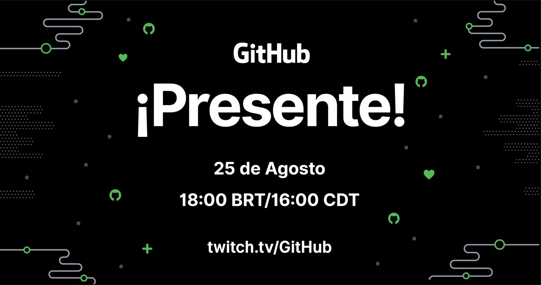 Nós temos o prazer de anunciar nosso Meetup virtual mensal na América Latina: GitHub ¡Presente! Os eventos acontecerão na última terça-feira todo mês, alternando entre Português e Espanhol. O evento deste mês será em Português. Vem participar com a gente!