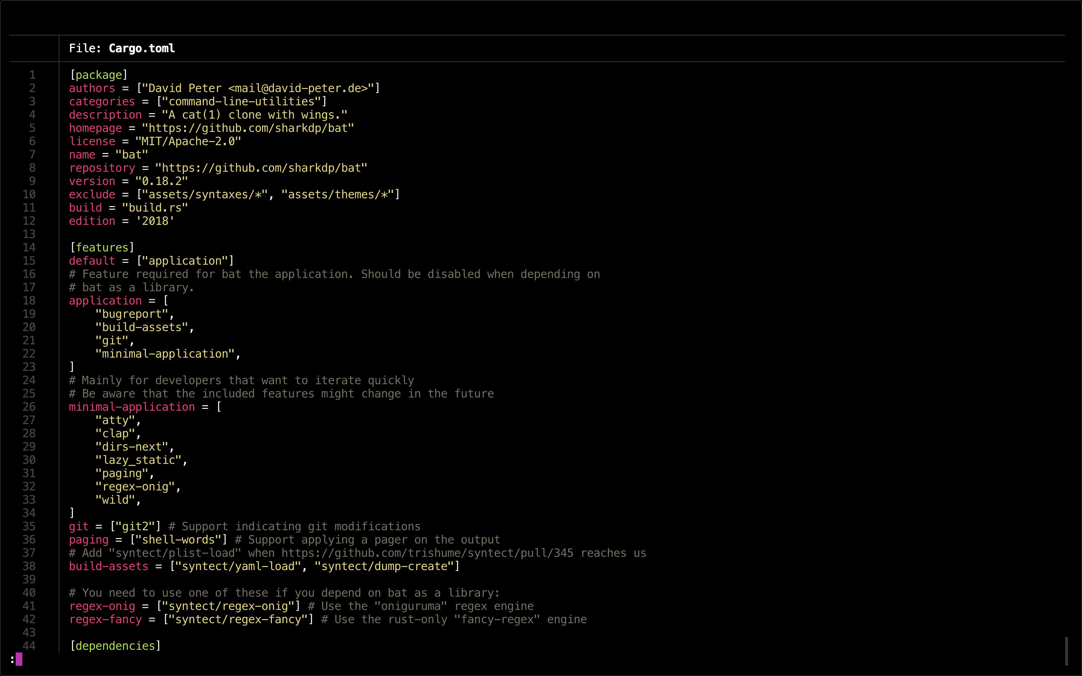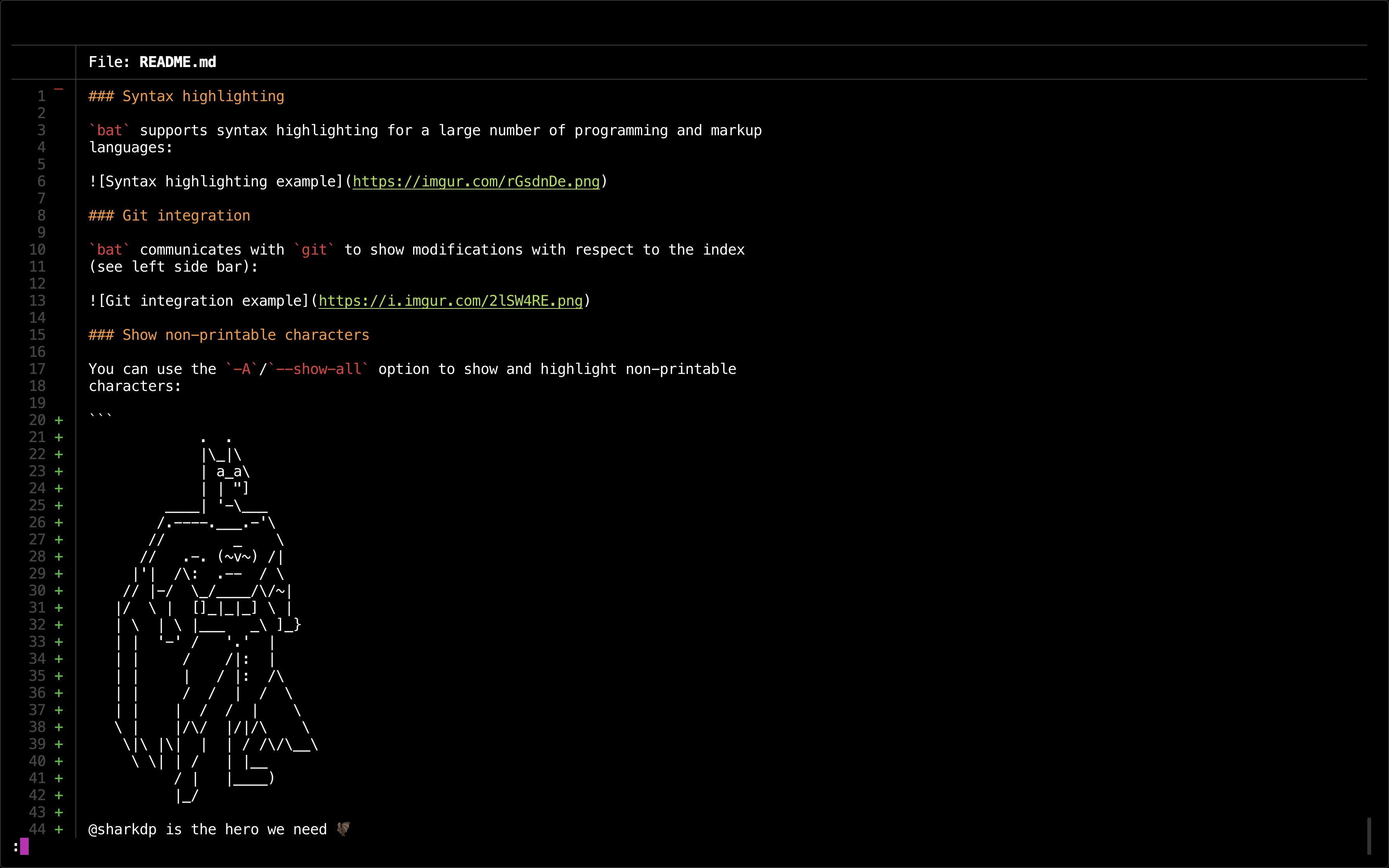 This `cat` alternative has Git integration, shows non-printable characters, syntax highlighting for Markdown + all of your favorite programming languages, and more!