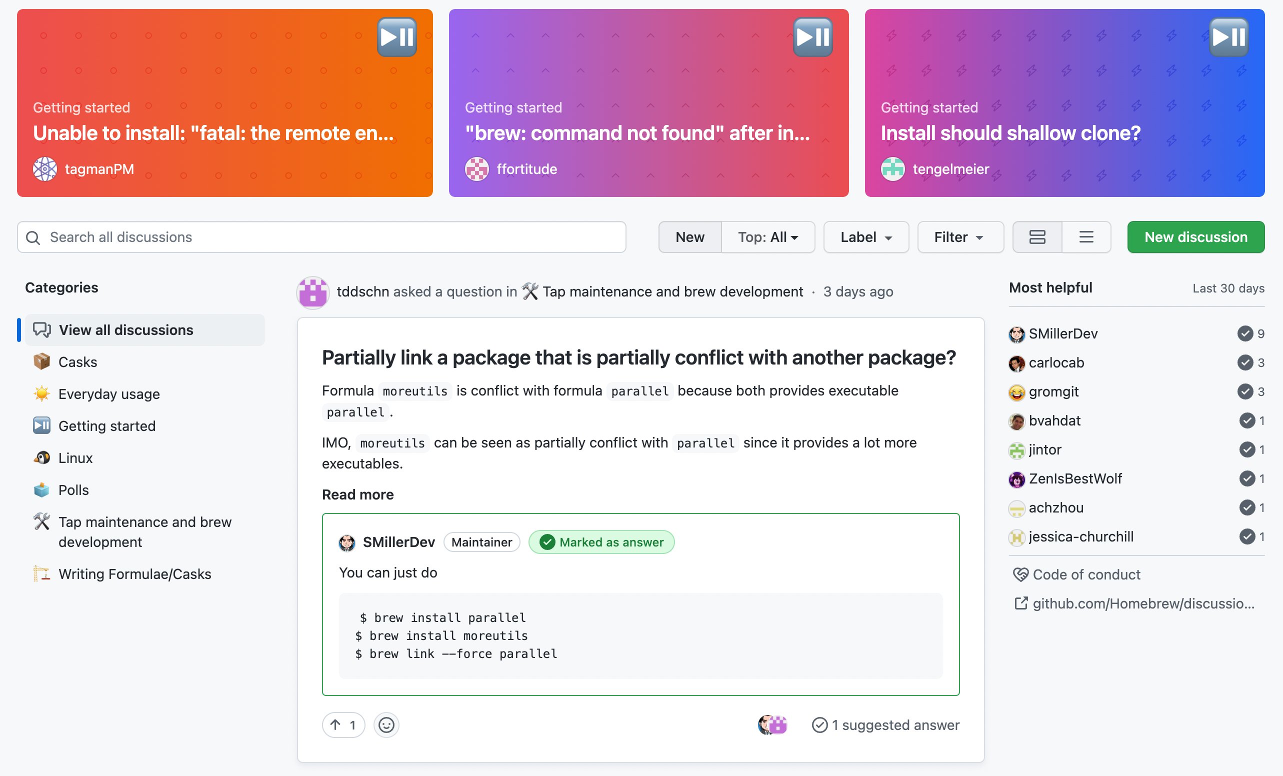 📌 Pin important topics of conversation for your community. @MacHomebrew spotlights commonly asked questions with GitHub Discussions.