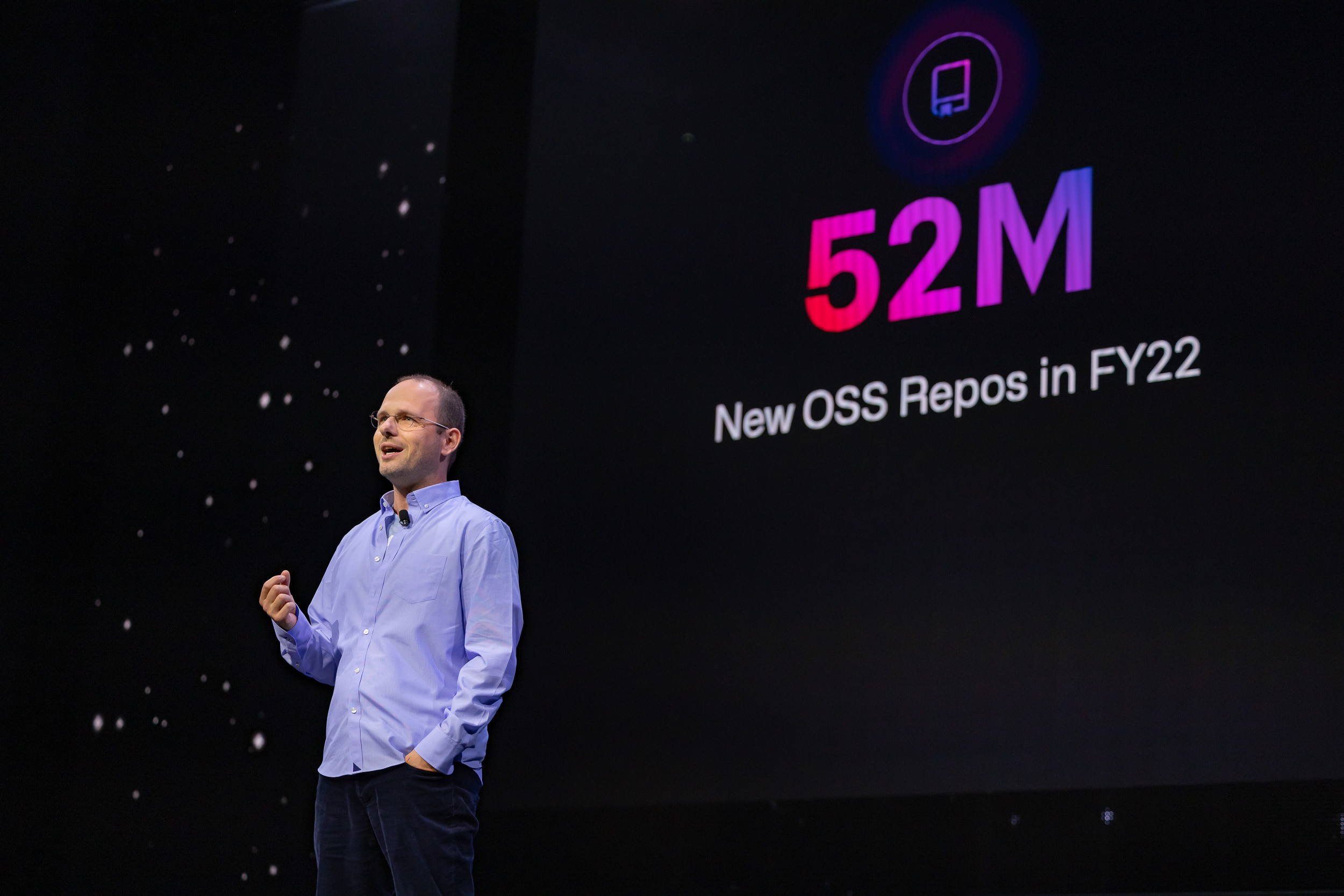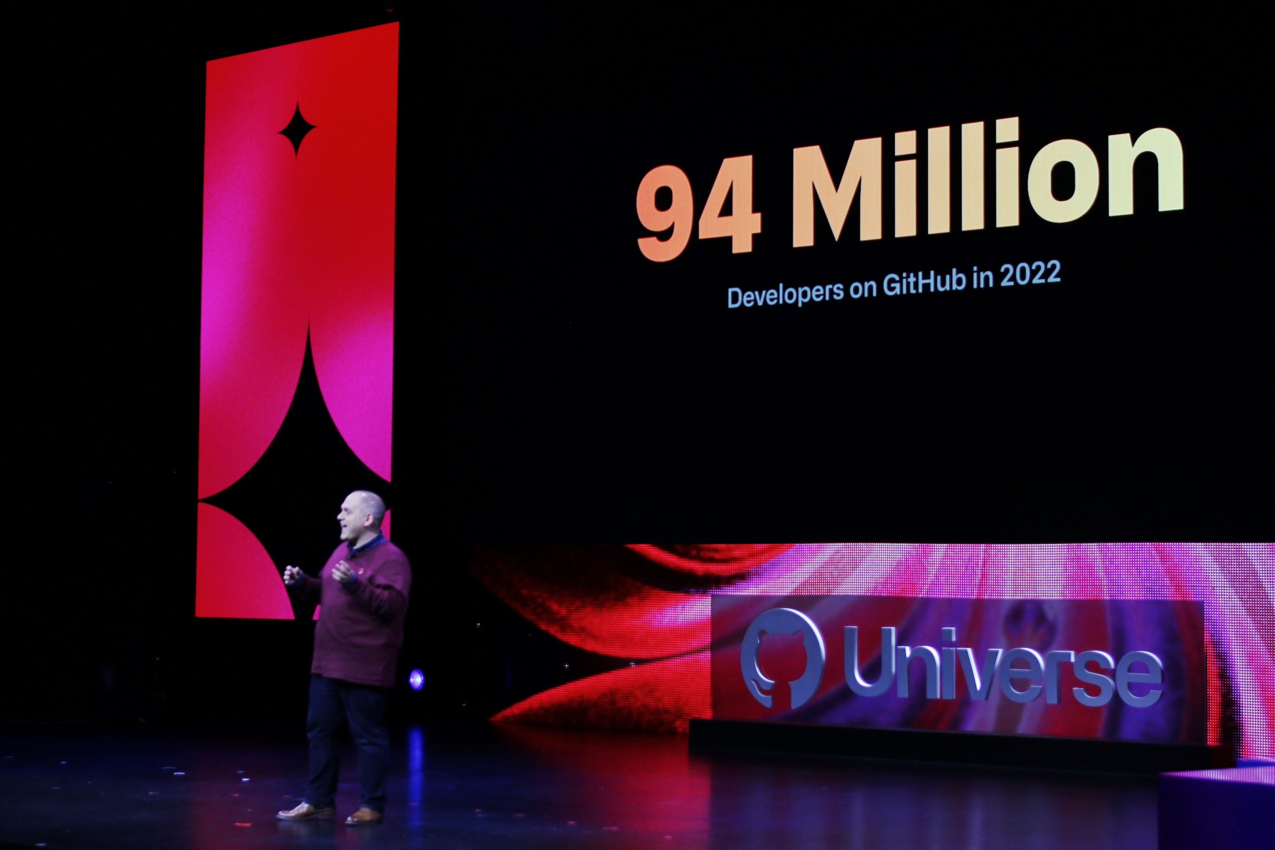 Celebrating 94M developers on @github in 2022 (up 📈from 2.8M 10 years ago) with @martinwoodward at #GitHubUniverse