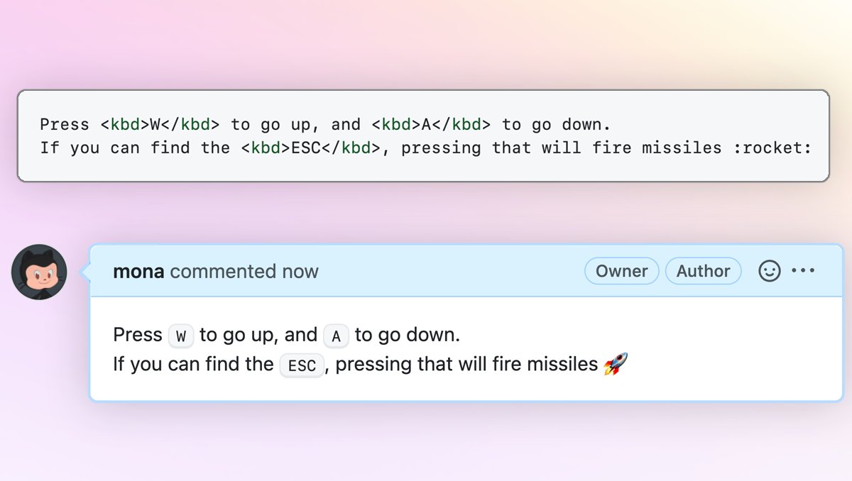 Did you know, you can use <kbd> tags in your Markdown on GitHub to make text appear like a button. It's perfect for documenting things like keyboard shortcuts and game controls in your READMEs, wikis and issues.